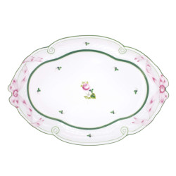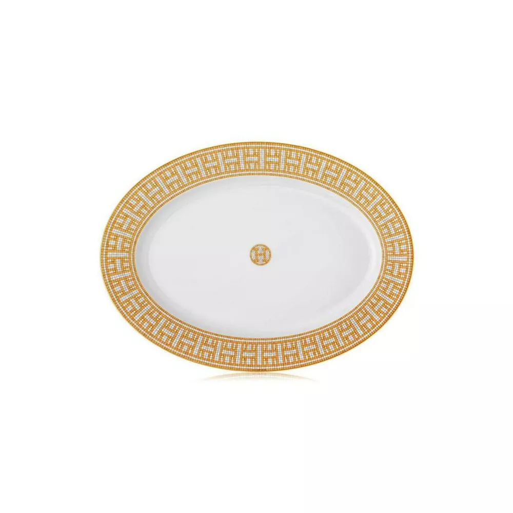 Hermes Mosaique au 24 Oval Tray Oval tray in porcelain with an elegant and decorative design, interspersed with gold tiles create geometrical patterns that blend the Art Deco and ancient Greek styles. Dimensions: 37 cm Code: 26027P For all Hermès products that are not available at the time of purchase, please consider a delivery time of 6 to over 12 months