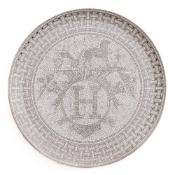 An exquisite porcelain piece with hand-applied decorations, the cake plate from the Mosaïque au 24 collection pays tribute to the original aesthetic of the historic Hermès boutique at rue du Faubourg-Saint-Honoré in Paris. Elegant geometric patterns, enriched with gold and platinum cabochons, blend Art Deco and ancient Greek influences. At its center, the iconic “H” monogram or Hermès ex-libris signature adds a final touch of sophistication.