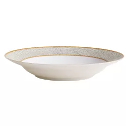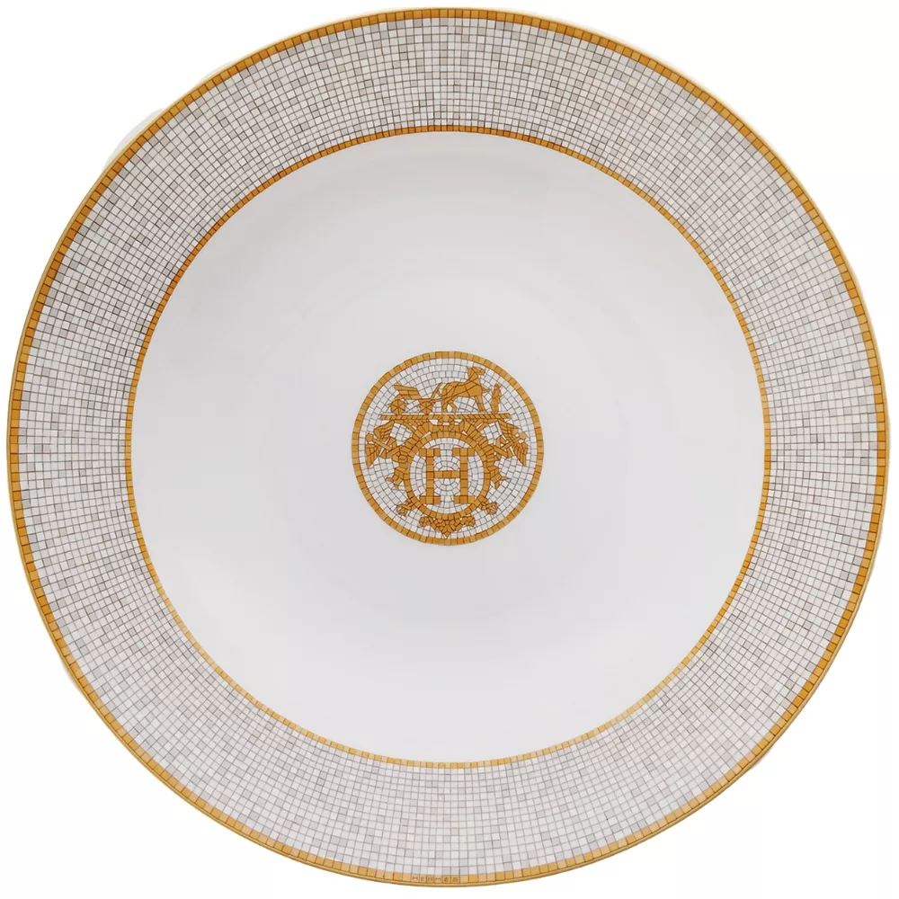 The Mosaique au 24 round deep tray by Hermès represents a perfect balance between decorative artistry and contemporary luxury. Crafted in porcelain with screen printed and hand applied decorations, it is enhanced by gold or platinum cabochons that highlight the refined geometric patterns of the collection.
