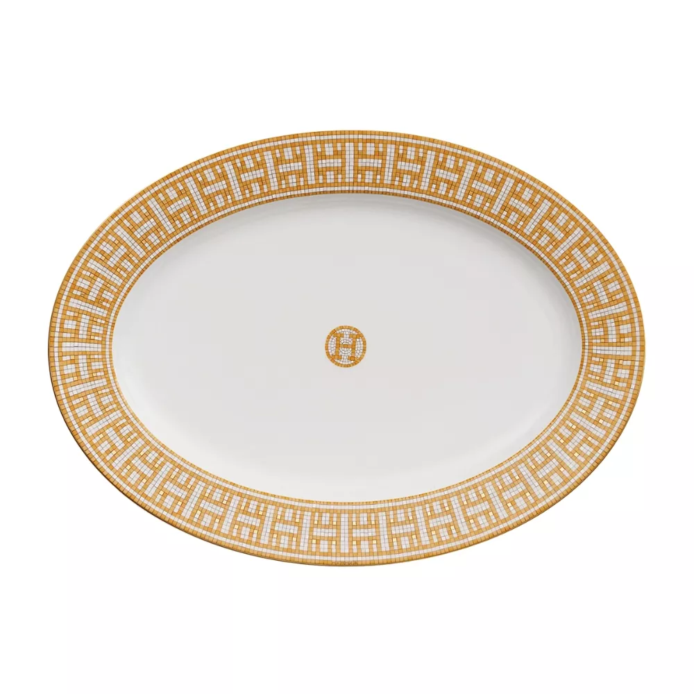 The Mosaique au 24 oval platter by Hermès is an expression of graphic elegance and contemporary luxury. Crafted in porcelain with screen printed and hand applied decorations, it is enhanced by gold or platinum tiles that highlight the refined geometric patterns of the collection.