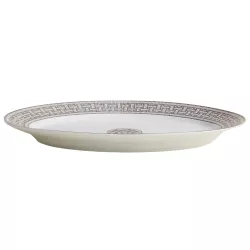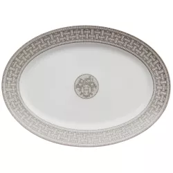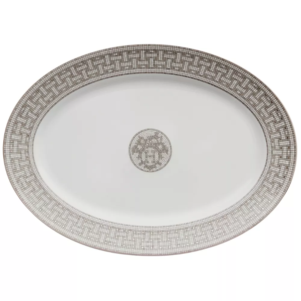 The Mosaique au 24 oval platter by Hermès is a refined expression of graphic elegance and contemporary luxury. Crafted in porcelain with screen printed and hand applied decorations, it is enhanced by platinum cabochons that highlight the sophisticated geometric patterns of the collection.