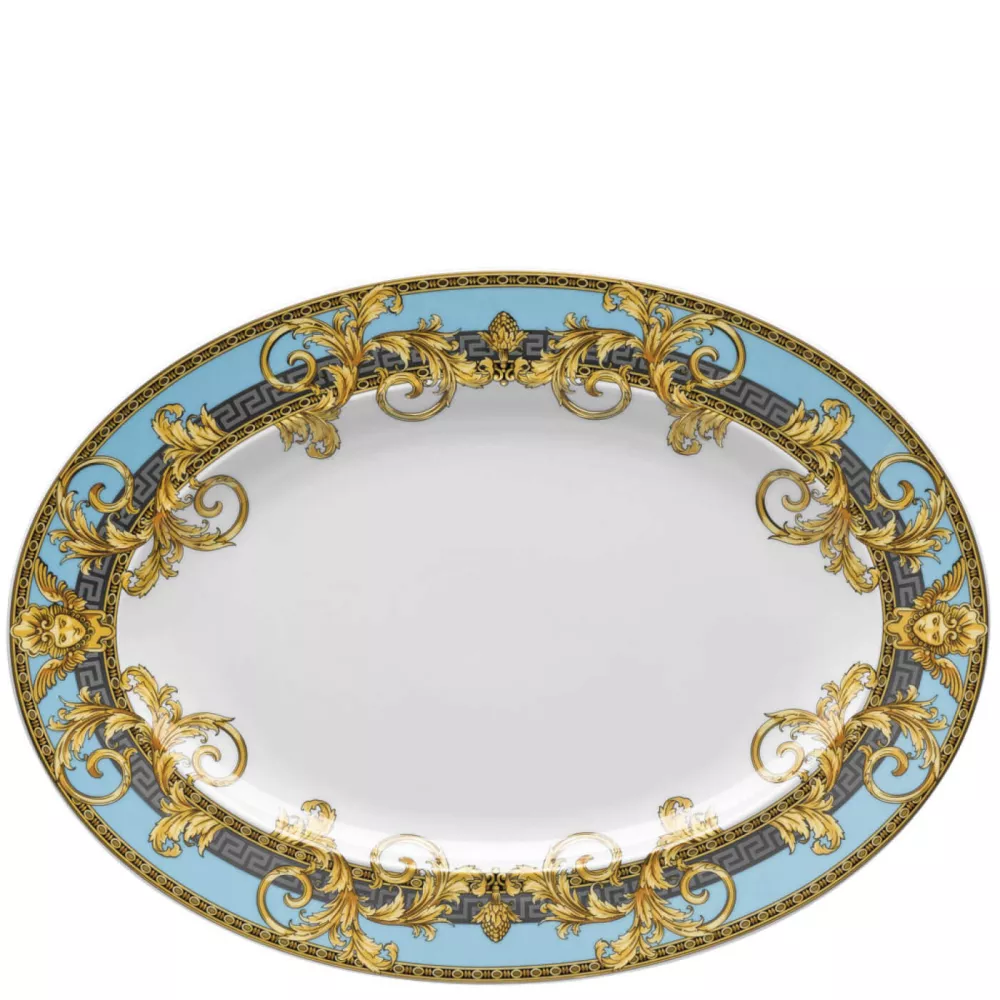 Gold baroque elements and a bold silver Greek key frame a luxurious vase and two imposing lions – the eloquent details of the new Prestige Gala collection. Inspired by the iconic Versace print “Le Vase Baroque”, the new design is enriched by gold and platinum embellishments, emphasized in black and turquoise. With a second variation in bright turquoise color – the Prestige Gala Le Bleu, the new range reflects the elegance of the iconic Prestige glass collection, and is the coronation to the Medusa Gala series. Oval platter. Dimensions: 34 x 24,5 cm