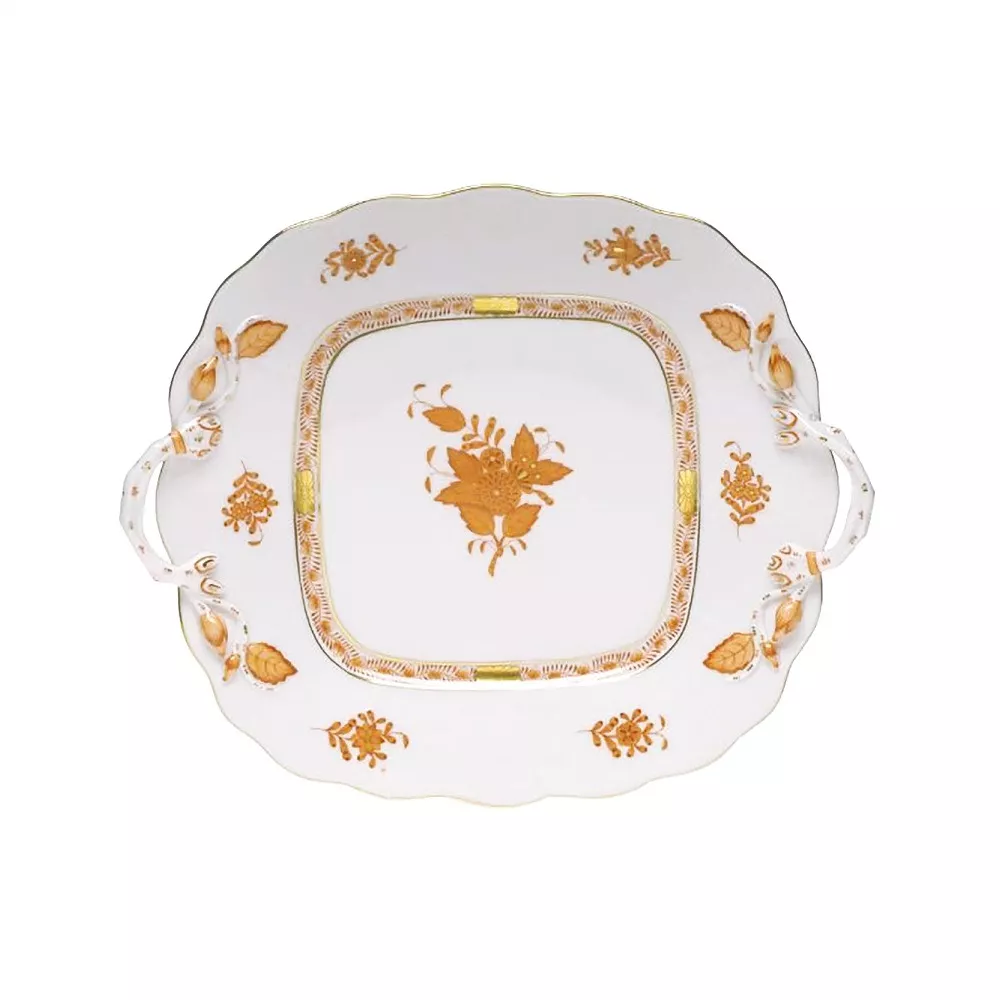 SQUARE CAKE PLATE 28 X 24,5 CM, APPONYI ORANGE AOG 1430 - HEREND The dècor, also known as the Chinese Bouquet, was created for Count Albert Apponyi, a famous Hungarian politician and diplomat of the late 19th century. The motif represent a basket of stylized Indian flowers painted rigorously freehand by the master painters of Herend. Square cake plate 28 x 24,5 cm Material: fine china with gold decorations Code: 1430 Hand wash recommended. Never microwave an item with gold or platinum trim.