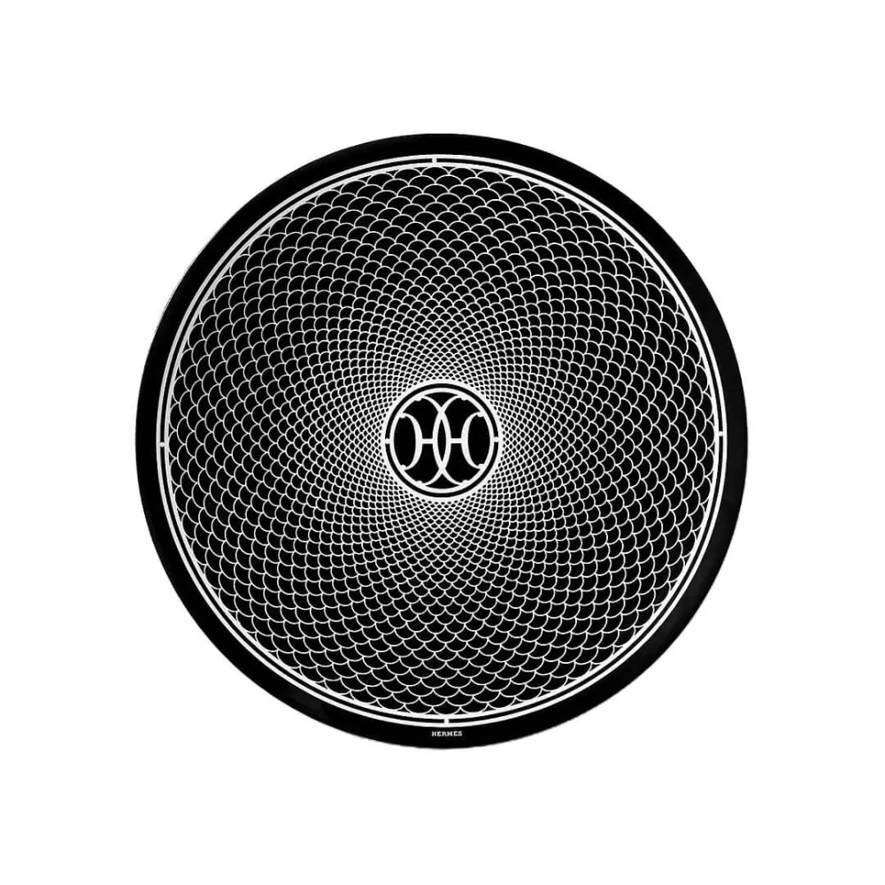 Hermes H Deco Bread & Butter Plate nr. 2 The Art Deco wrought-iron friezes which adorn the Hermes 24 Faubourg and rue de Sevres stores, inspired H Deco. This very Parisian service is stamped with the initials HH, around which an intricate black and white decoration spirals. Dimensions: 14 cm Code: 37112P For all Hermès products that are not available at the time of purchase, please consider a delivery time of 6 to over 12 months
