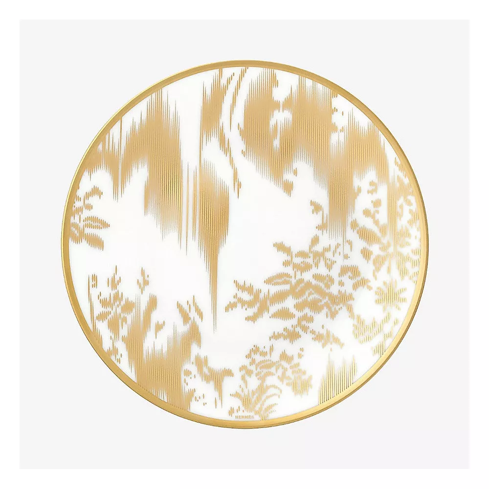 Hermes Voyage en Ikat Bread & Butter Plate gold Inspired by ikat, an exceptional weaving and dyeing technique originating in Asia, Voyage en Ikat celebrates intermingled uses and an ongoing dialogue between East and West. More than twenty hues centered on sapphire, ruby and emerald, are enhanced by 24-carat matte gold and come to life in designs composed ‘thread by thread’. Dimensions:14 cm Material: porcelain Code: 36112P For all Hermès products that are not available at the time of purchase, please consider a delivery time of 6 to over 12 months
