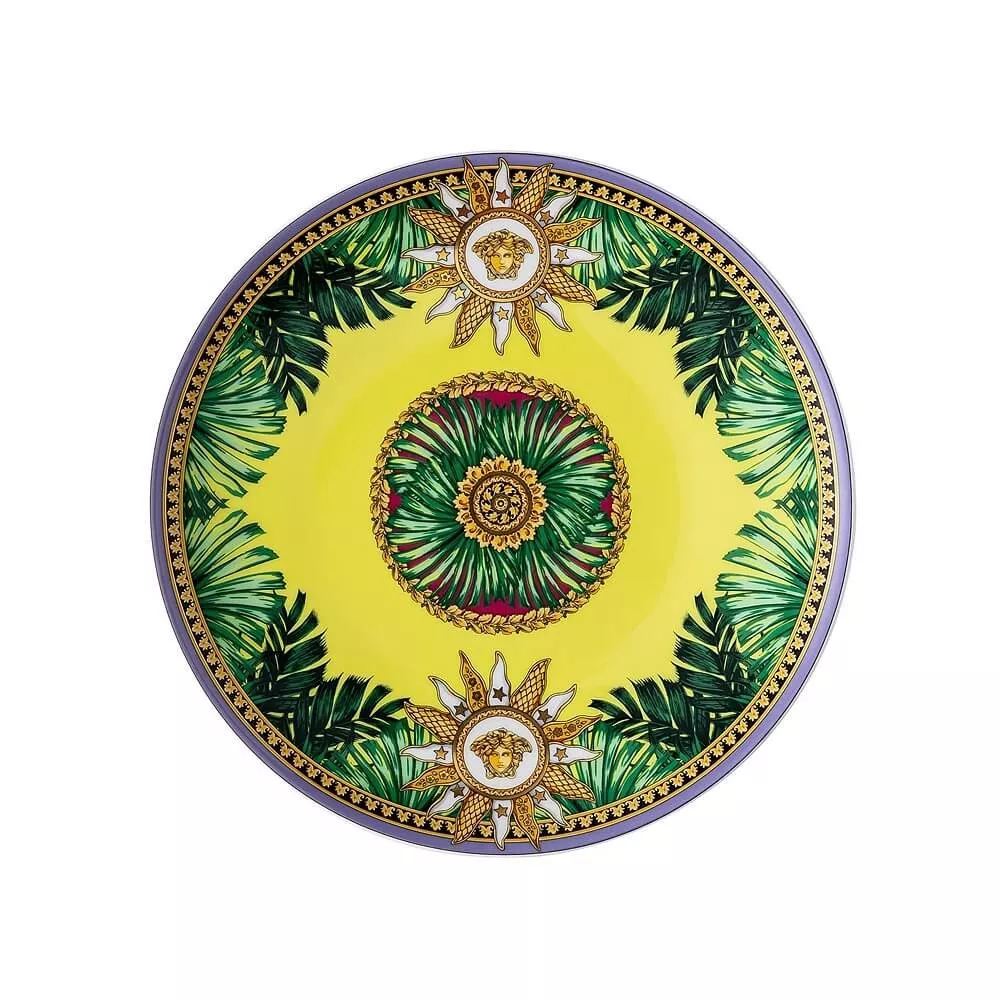 FLAT PLATE 17 CM, JUNGLE ANIMALIER 19335-403713-10217 - VERSACE The latest fine porcelain collection fuses the iconic Jungle print with animalier patterns and heritage Medusa accents. The Jungle Animalier line refreshes tableware in a vivid color palette. Crafted in exceptional quality porcelain. SKU: 19335-403713-10217 Diameter: 17.0 cm Material: Porcelain