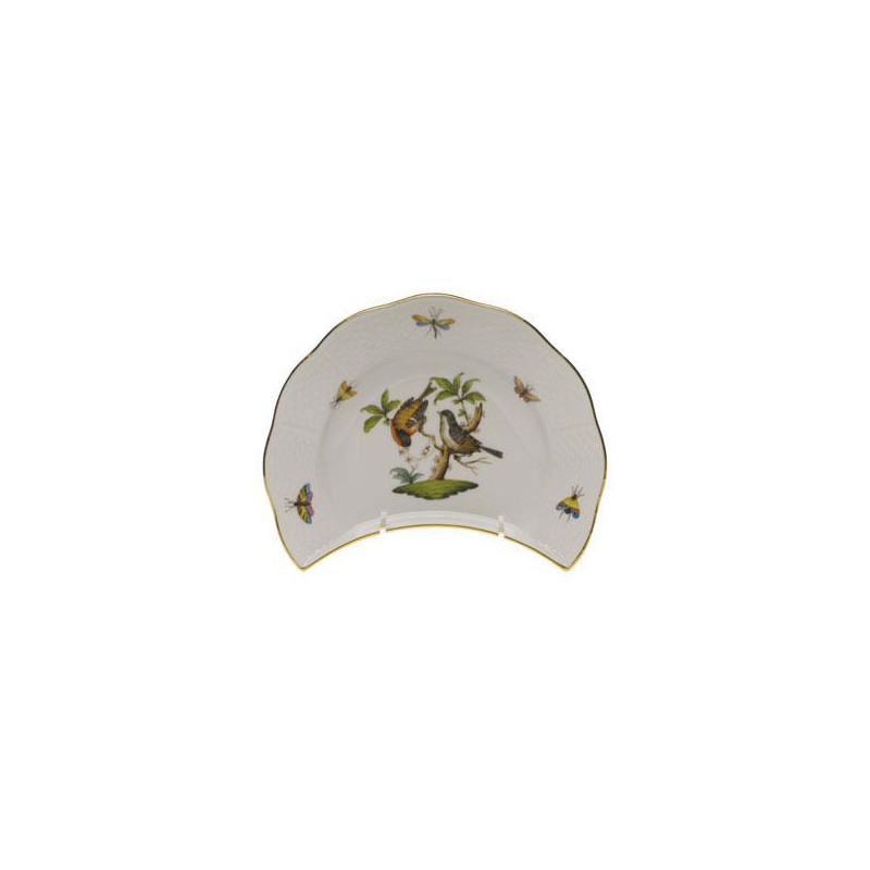 WARNING: THE ROTHSCHILD LINE BY HEREND, IS COMPOSED BY 12 DIFFERENT MOTIFS FOR PLATES AND CUPS. CONTACT US FOR MORE INFORMATION Rothschild Birds, one of the Best Known Herend pattern, takes its name from the important baronial Rothschild family. The RO main elements are two Bird with a Golden Necklace (there are twelve variants of the couple of birds). This pattern is ispired to a 19th century tale about Baroness Rothschild, who lost her pearl necklace in the garden of her viennese residence. Several days later it was found by her gardener, who saw some birds playing with it in a tree. Crescent Salad Plate 20,5 x 13 cm Material: fine china with gold decorations Code: 1530 Hand wash recommended. Never microwave an item with gold or platinum trim.