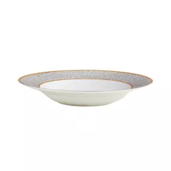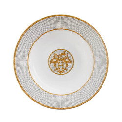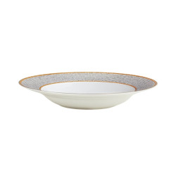Porcelain soup or pasta plate. Hand-applied and screen-printed decorations. Gold or platinum cabochons.