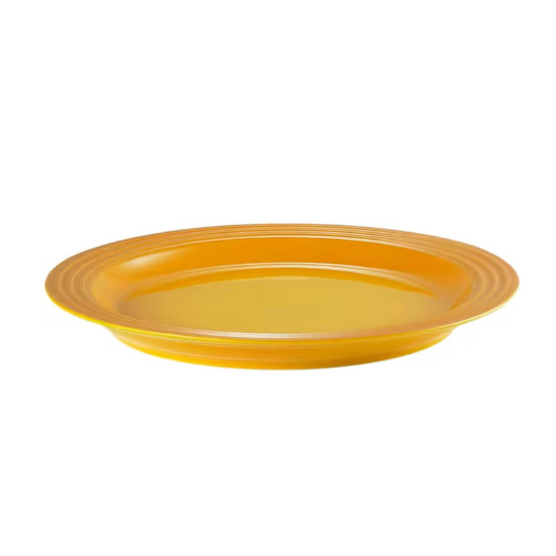 DINNER PLATE 27 CM, STONEWARE VANCOUVER - LE CREUSET A colorful and contemporary addition to any modern kitchen or dining table, the Le Creuset 27cm dinner plate is a wide and shallow shape, perfect for serving your first or second course. The rim features the distinctive Le Creuset signature three-ring branding. This plate is oven, microwave, and dishwasher safe, making it perfect for a busy home for both everyday use or entertaining friends and family. Le Creuset stoneware and dinnerware ranges offer the highest quality in the kitchen. Material: Stoneware Dimensions: L: 27 cm Suitable for temperatures from -23° up to 260 degrees Celsius (compatible with oven and microwave use within the indicated temperatures), dishwasher safe.