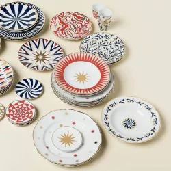 The Abracadabra collection, designed by the La Tigre studio (Luisa Milani and Walter Molteni) for Bitossi Home, brings graphic magic to your table. This dinner plate features multi-pointed stars, pinwheels, and optical illusions alongside softer designs, all accented with gold details. Ideal for those who appreciate vibrant elegance and refined design, the collection turns every dining experience into a visual delight.