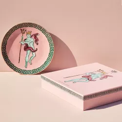 A magnificent 33 cm charger plate in pink hues, featuring Neptune, the god of the sea, draped in a coral red cloth and holding his iconic trident. Perfect for marking guests' places at the table or as a stylish centerpiece, this artistic piece elevates any meal to an unforgettable experience. Its beauty makes it ideal for decorating kitchens or living rooms, capturing attention every time.