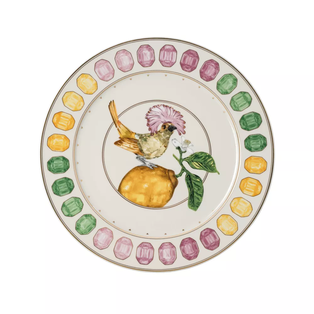 The Idyllia flycatcher serving plate, created in collaboration with Rosenthal, blends color, nature, and design into a refined and distinctive piece. Crafted from marshmallow porcelain using an exclusive technique, it features a luminous pattern inspired by the brilliance of crystals, with decorative gems along the rim and an elegant flycatcher perched on a lemon at the center. Delicate gold toned lines enhance the design, adding a sophisticated and unique touch to any table setting.