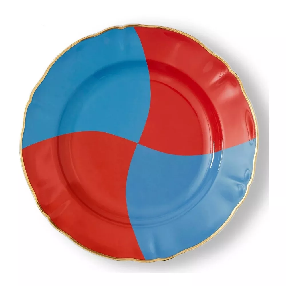 Porcelain dessert plate with colorful decorations and gold details · Dishwasher safe up to 250 cycles · Not microwave safe Material Porcelain Colors and Finishes Gold decal