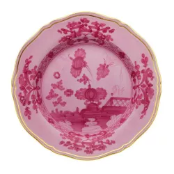 The Oriente Italiano collection by Ginori creates a lush, vibrant garden of exotic flowers, offering an exuberant and unusual feast for the eyes. Combining two elements of Italian artistic tradition: the elegance of the Antico Doccia Ginori collection lines and the delicate charm of the Garofano, a typical floral motif found in Faenza ceramics inspired by an imaginary oriental garden, this plate bursts with vibrant colors, bringing life to any table setting.