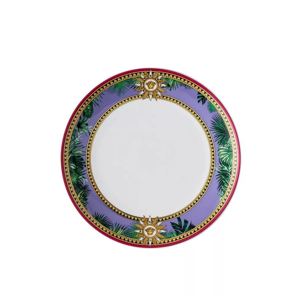 DESSERT PLATE 21 CM, JUNGLE ANIMALIER 19335-403713-10221 - VERSACE The latest fine porcelain collection fuses the iconic Jungle print with animalier patterns and heritage Medusa accents. The Jungle Animalier line refreshes tableware in a vivid color palette. Crafted in exceptional quality porcelain. SKU: 19335 403713 10221 Diameter: 21.0 cm Material: Porcelain