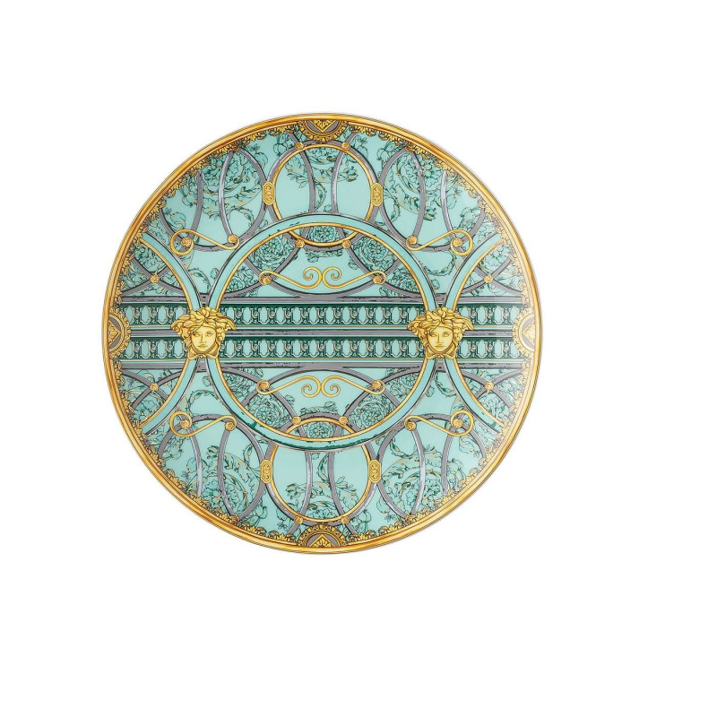 As you enter the Milanese palazzo in Via Gesù that Versace calls home, before discovering the famous mosaic of the world’s most powerful feminine icon - the Medusa - a scenic marble staircase catches your eye. Swirling metallic spirals ascending into the Versace casa are the inspiration for the new “La Scala del Palazzo” fine porcelain dinner service from Rosenthal meets Versace collection. A hint at what happens behind closed doors, the central circular element gives a first sighting into the intimacy beyond the staircase. The architectural style of the collection is enriched by an elegant green and pastel rose palette, reminiscent of the classical Italian palazzi facades. A contemporary shape that embraces expertly crafted coupe plates for the very first time. Unique and with a strong personality. Material: porcelain Diameter: 21 cm
