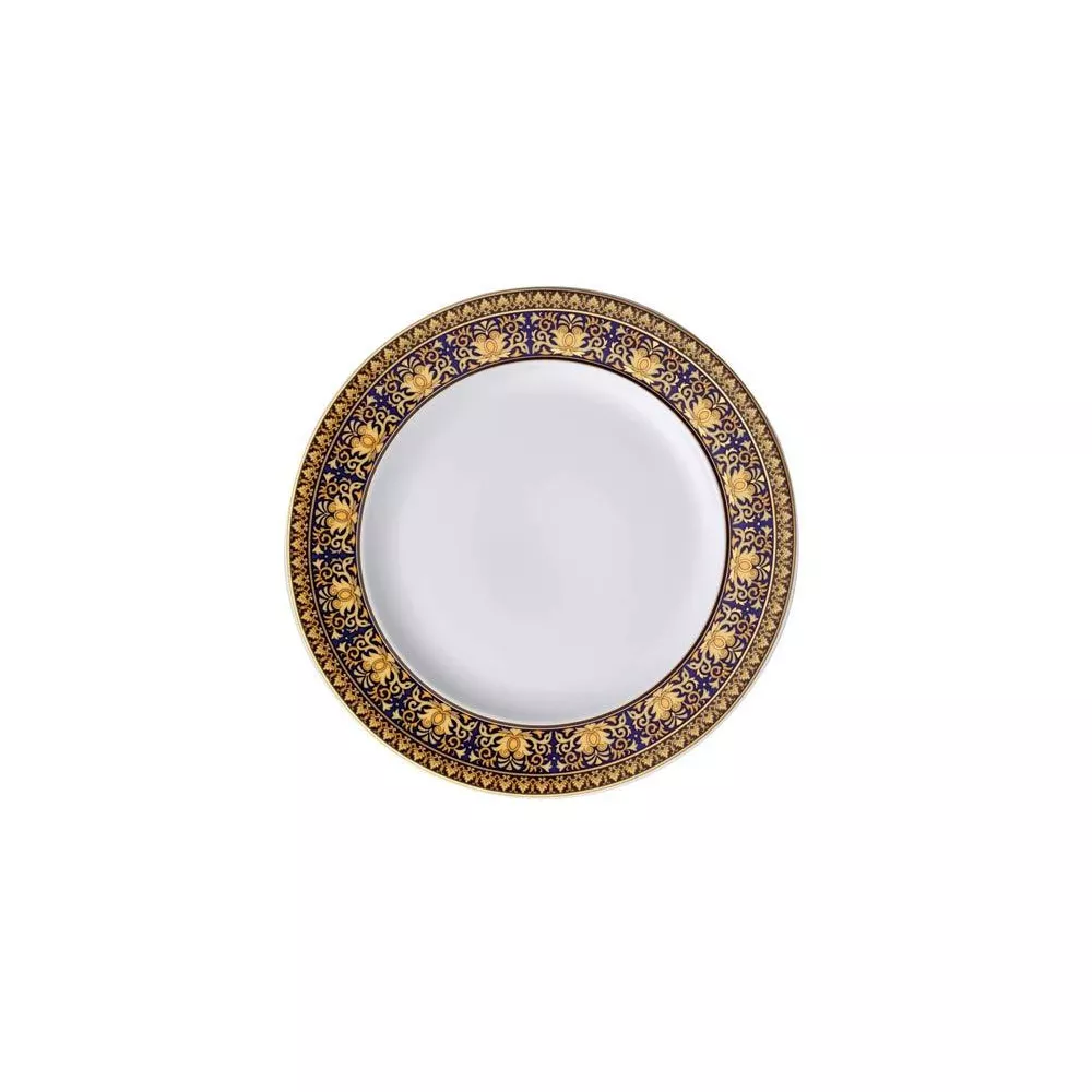This classy Versace dinnerware is called Medusa Blue. It is produced using the finest porcelain creating a style that is best described as luxurious and glamorous. The most prominent color of this item is blue. Lavish ornaments decorate this piece and make it a 'must have' for everyone in love with opulent design. Dishwasher safe. It is scratch- and wear-resistant. However, gold decors are not totally scratch resistant by virtue of their natural material properties. Dimensions: cm 22