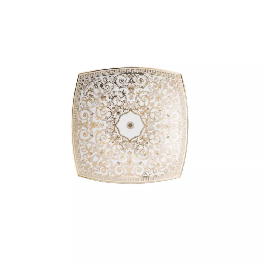 This fine Versace pattern is called Medusa Gala. It is produced using the finest porcelain creating a style that is best described as luxurious and glamorous. The most prominent color of this item is gold. Lavish ornaments decorate this piece and make it a 'must have' for everyone in love with opulent design. Dimensions: cm 18 x 18