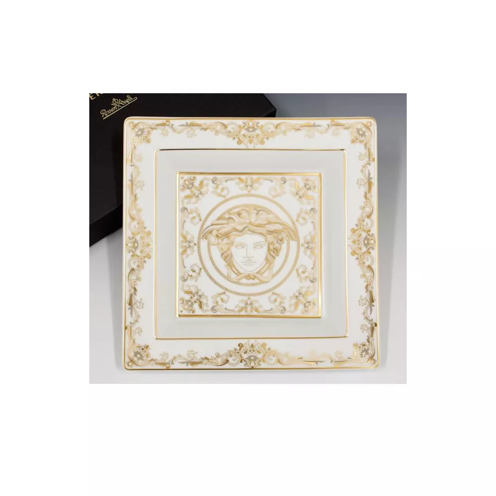 This fine Versace pattern is called Medusa Gala. It is produced using the finest porcelain creating a style that is best described as luxurious and glamorous. The most prominent color of this item is gold. Lavish ornaments decorate this piece and make it a 'must have' for everyone in love with opulent design. Dimensions: cm 22 x 22
