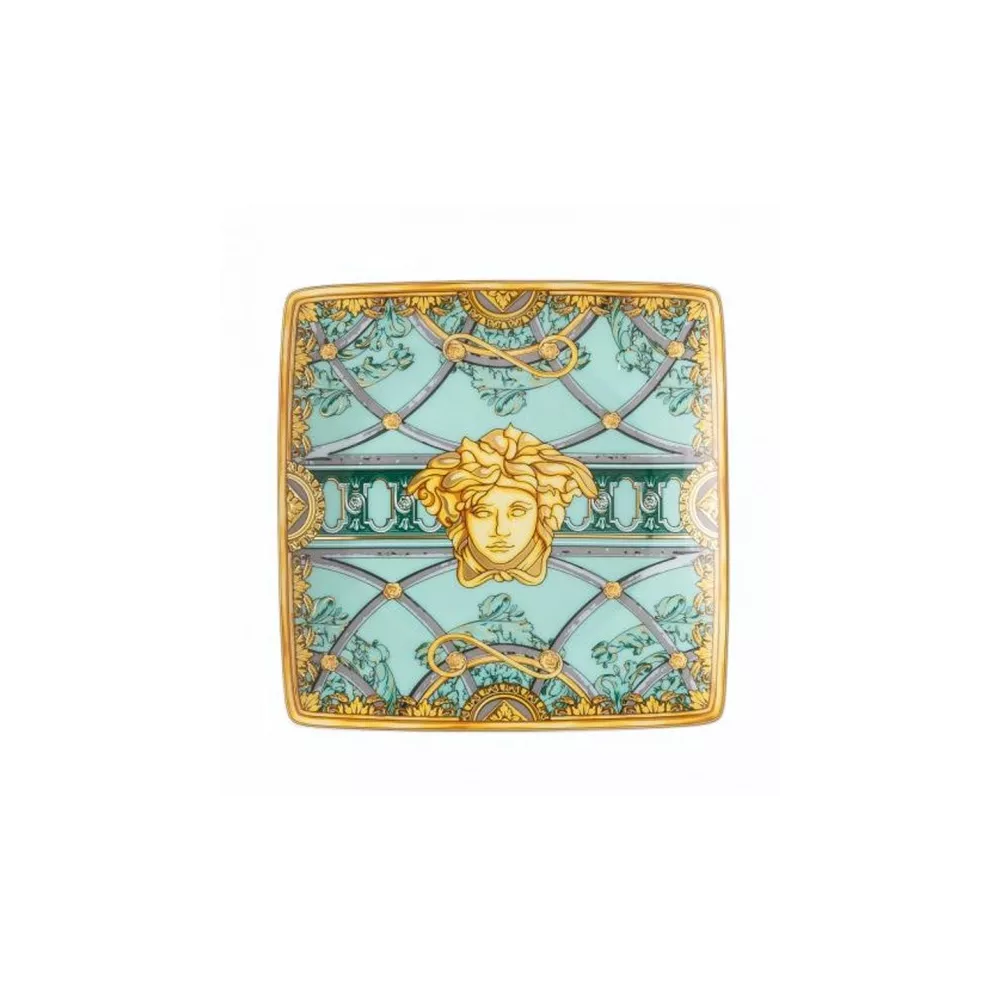As you enter the Milanese palazzo in Via Gesù that Versace calls home, before discovering the famous mosaic of the world’s most powerful feminine icon - the Medusa - a scenic marble staircase catches your eye. Swirling metallic spirals ascending into the Versace casa are the inspiration for the new “La Scala del Palazzo” fine porcelain dinner service from Rosenthal meets Versace collection. A hint at what happens behind closed doors, the central circular element gives a first sighting into the intimacy beyond the staircase. The architectural style of the collection is enriched by an elegant green and pastel rose palette, reminiscent of the classical Italian palazzi facades. A contemporary shape that embraces expertly crafted coupe plates for the very first time. Unique and with a strong personality. Material: porcelain Diameter: 12 cm