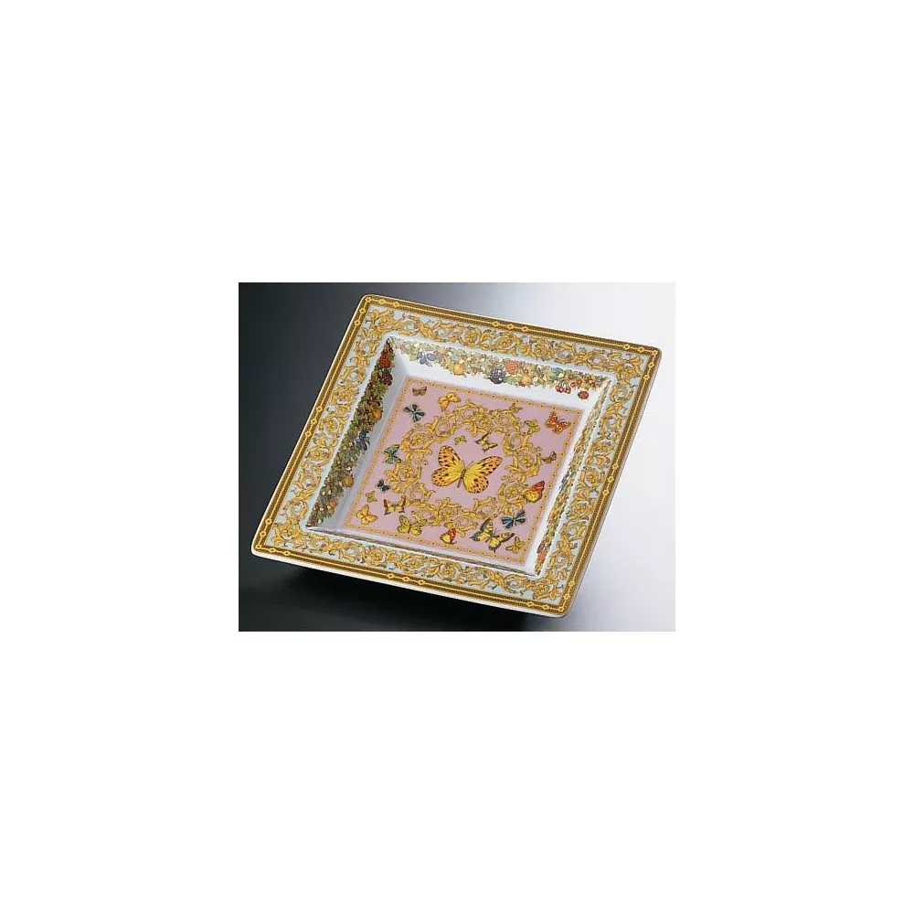 This wonderful Versace pattern is called Le Jardin de Versace. It is produced using the finest porcelain creating a style that is best described as luxurious and glamorous. cm. The most prominent color of this item is actually a mix out of multiple colors. Playful floral decorations make this piece an eye catcher on every table or countertop. Dimensions: 22x22 cm