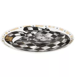 The Fornasetti 2026 Calendar Plate is an iconic collectible first introduced in 1968 and reissued each year in a limited edition. This edition draws inspiration from the High Fidelity collection, featuring the signature sly cat revealing the 2026 calendar through a refined checkerboard pattern. Crafted in decorated porcelain, it is designed as an ornamental wall piece that adds character and sophistication to any space. Due to its artisanal production, slight variations may occur, highlighting the uniqueness of each plate.