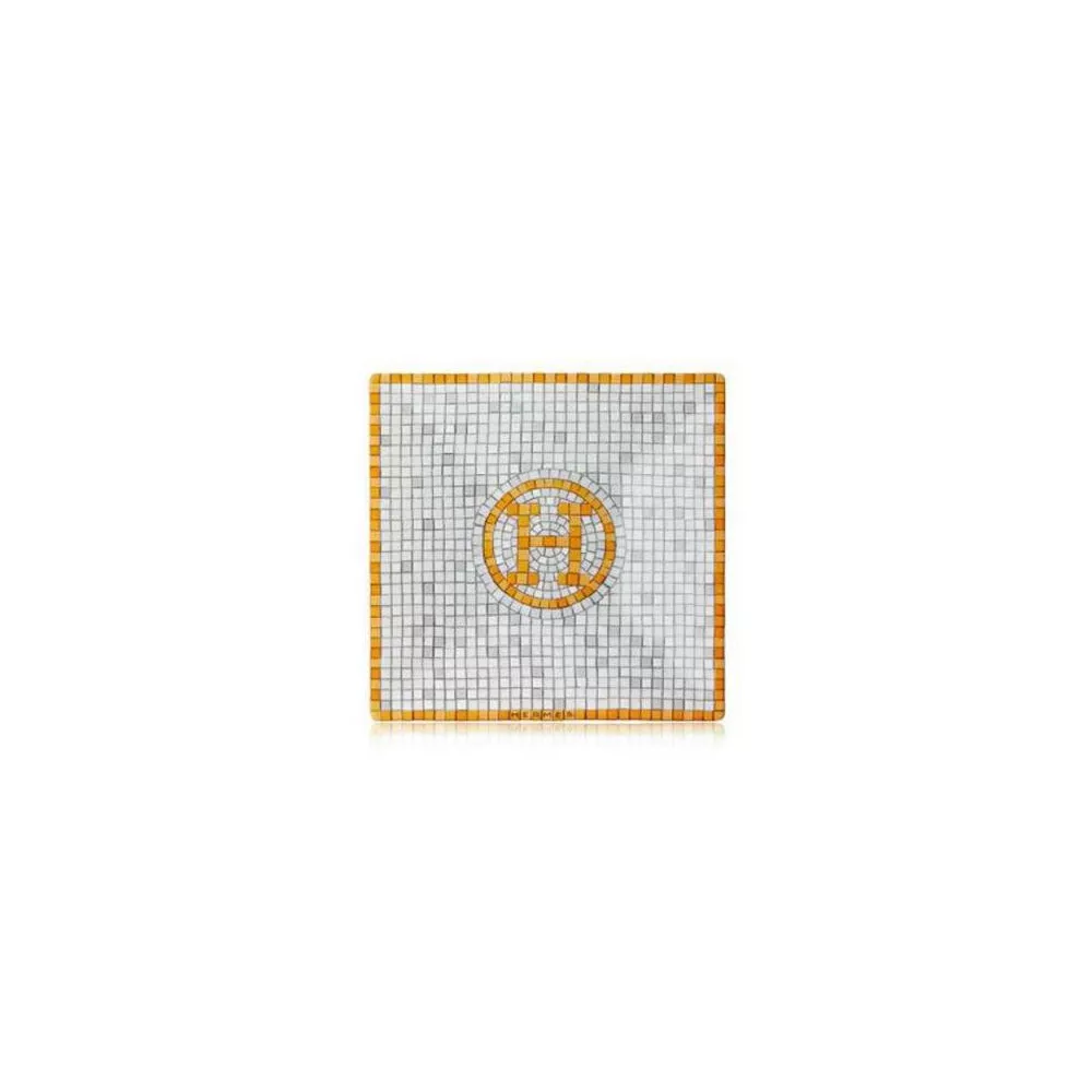 Hermes Mosaique au 24 Or Square Plate nr. 1 Square plate in porcelain with an elegant and decorative design, interspersed with gold tiles create geometrical patterns that blend the Art Deco and ancient Greek styles. Dimensions: diameter 7 x 7 cm Code: 26041P For all Hermès products that are not available at the time of purchase, please consider a delivery time of 6 to over 12 months
