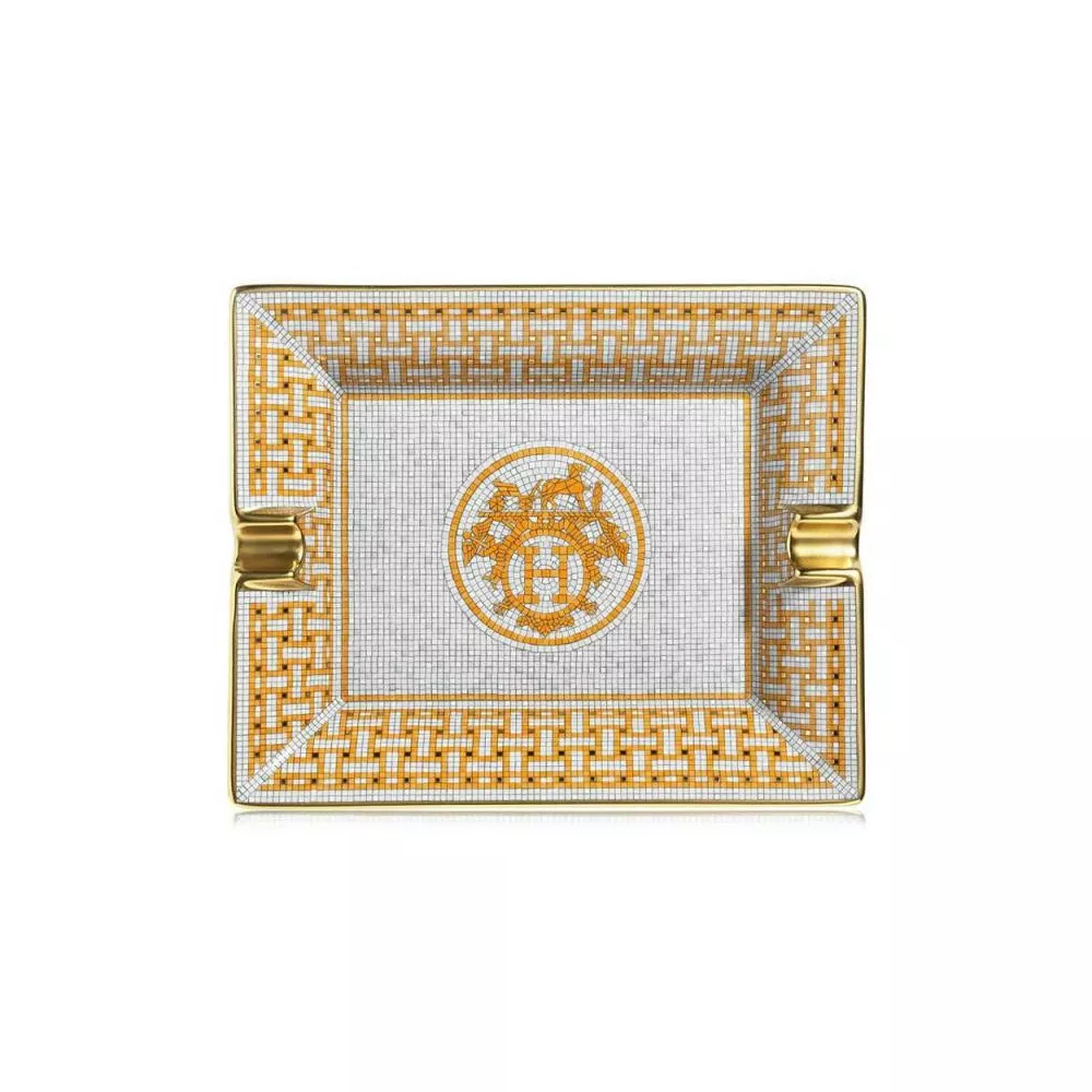 Hermes Mosaique au 24 Or Ashtray Posacenere in porcelain with an elegant and decorative design, interspersed with gold tiles create geometrical patterns that blend the Art Deco and ancient Greek styles. Dimensions: 19,5 x 16 cm Code: 26096P For all Hermès products that are not available at the time of purchase, please consider a delivery time of 6 to over 12 months