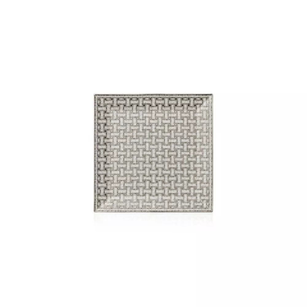 Hermes Mosaique au 24 Platinium Square Plate nr. 4 In homage to the mosaic which covers the floor of 24 Faubourg Saint-Honoré, the historic Hermès store, the geometric friezes in matte grey tones, enhanced with platinum, play with the light. Dimensions: 19 x 19 cm Code: 35044P For all Hermès products that are not available at the time of purchase, please consider a delivery time of 6 to over 12 months