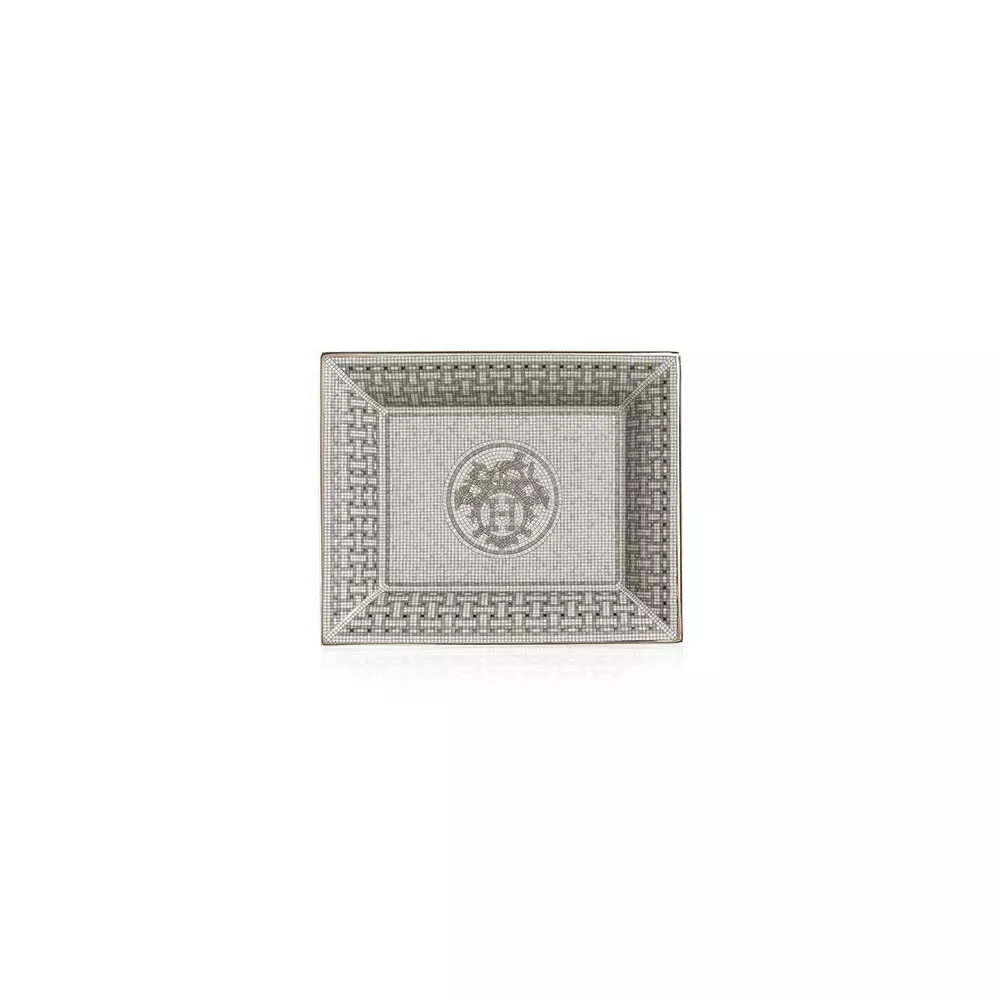 Hermes Mosaique au 24 Platinium Vide-poches In homage to the mosaic which covers the floor of 24 Faubourg Saint-Honoré, the historic Hermès store, the geometric friezes in matte grey tones, enhanced with platinum, play with the light. Dimensions: 21 x 17 cm Code: 35090P For all Hermès products that are not available at the time of purchase, please consider a delivery time of 6 to over 12 months