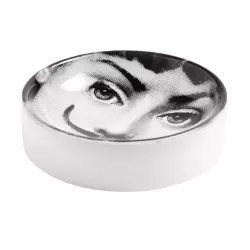 Part of the renowned Tema e Variazioni series, this hand-decorated porcelain ashtray features the iconic face of Lina Cavalieri, reimagined by Piero Fornasetti in a surrealist style reminiscent of Dalì. An everyday object turned into a true collector’s piece, blending artistry and utility. Each creation is unique, bearing the marks of Fornasetti’s artisanal craftsmanship.