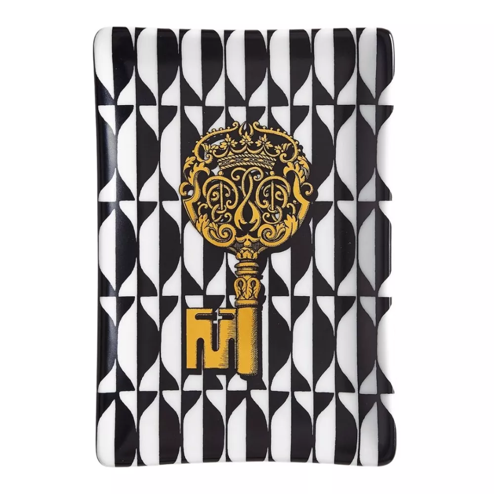 Reality and illusion merge in this Fornasetti ashtray, where the charm of golden antique keys contrasts with the strict black-and-white geometry. Hand-silkscreened on porcelain, it belongs to the Antichità Contemporanea collection, unveiled during Milan Design Week 2021. Each piece is unique, and slight variations highlight the artisanal craftsmanship.