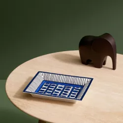 The Bleus dAilleurs change tray features hand-laid screen-printed geometric motifs, where deep blue shades contrast with pure white porcelain to evoke distant and dreamlike landscapes. Finished with a velvet goatskin base, it blends decorative elegance with luxurious craftsmanship, perfect as a refined accent on any surface.