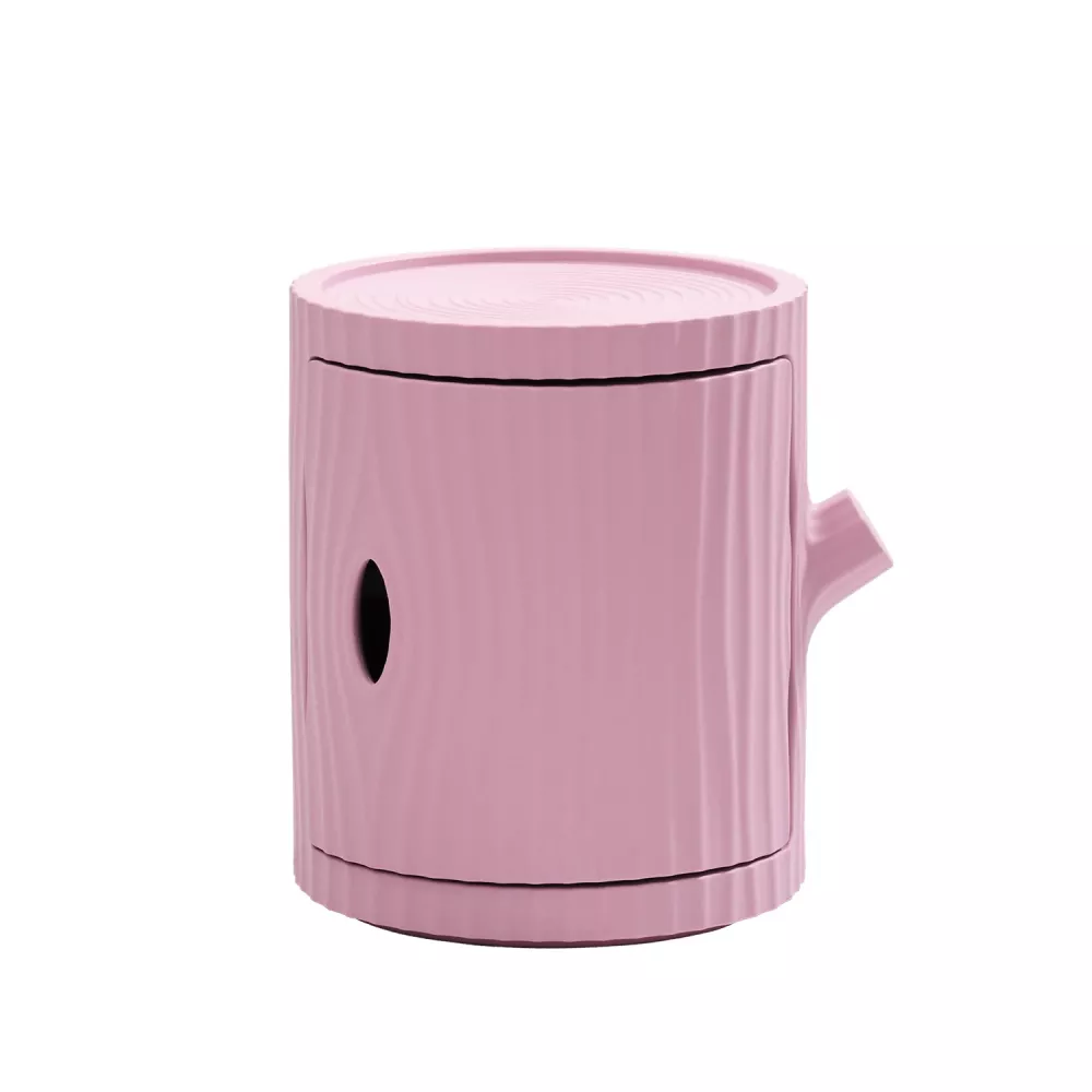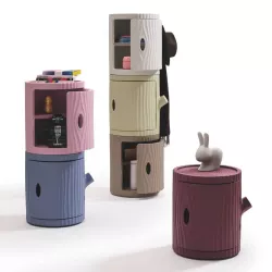 Tronco, designed by Furf Design Studio, is a multifunctional container inspired by the shape of a tree trunk. Made of recyclable polyethylene, it serves as a storage unit for essentials or as a surface to place objects. Its stackable design allows you to build sculptural columns that double as coat or towel racks.