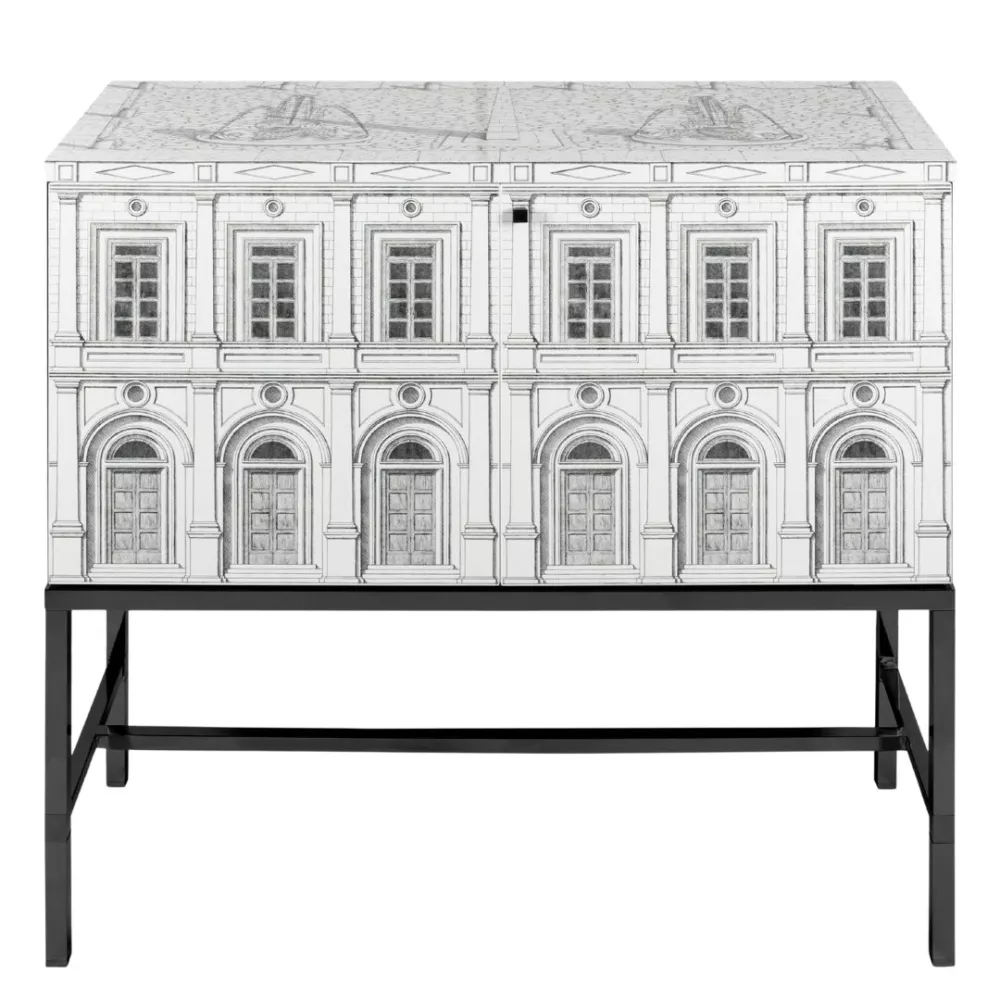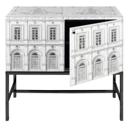 The Raised Architettura cabinet by Fornasetti is a refined storage piece that blends design and decorative art. Crafted from screen-printed and hand-lacquered wood, it evokes Renaissance façades, a hallmark of the Atelier’s imagination, bringing elegance and sophistication into any space. Featuring an adjustable internal shelf and a hand-decorated top with protective glass, this unique cabinet combines practicality with unmistakable artistry.