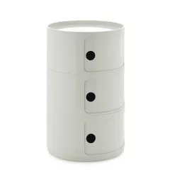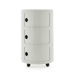 Designed by Anna Castelli Ferrieri in 1967, the three-element Componibile is a true icon of Italian design, combining timeless aesthetics with outstanding modular functionality. It is typically used as a side table next to sofas or armchairs, as a small cabinet for an office or study, as an entryway storage unit, as a bathroom cabinet, or as a bedside table. The renewed 42 cm round version features an updated industrial mould that enhances quality, detail and overall finish. Its expanded colour palette blends contemporary tones with elegant vintage nuances, making it a versatile piece suitable for any interior. The practical interlocking system ensures flexibility and ease of use, while additional wheels—available separately—allow even greater customization.