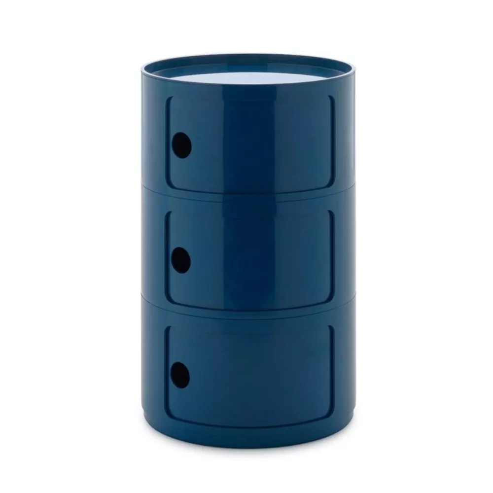 Designed by Anna Castelli Ferrieri in 1967, the three-element Componibile is a true icon of Italian design, combining timeless aesthetics with outstanding modular functionality. It is typically used as a side table next to sofas or armchairs, as a small cabinet for an office or study, as an entryway storage unit, as a bathroom cabinet, or as a bedside table. The renewed 42 cm round version features an updated industrial mould that enhances quality, detail and overall finish. Its expanded colour palette blends contemporary tones with elegant vintage nuances, making it a versatile piece suitable for any interior. The practical interlocking system ensures flexibility and ease of use, while additional wheels—available separately—allow even greater customization.