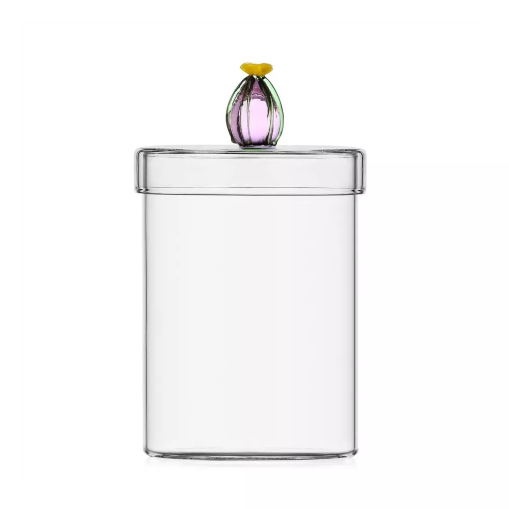 From the Desert Plants collection by Alessandra Baldereschi, this borosilicate glass box features a delicate pink flower detail. Handmade and lampworked, it blends artisanal charm with botanical inspiration. Perfect for storing small items or adding a decorative accent to any space, it reflects the creative spirit of the collection.