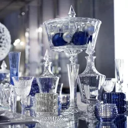The Mille Nuits Tall Candy Box by Baccarat, designed by Mathias, is an elegant clear crystal creation evoking the charm of Oriental tales. Subtle Venetian stripes enhance its refinement, making it a precious decorative element as well as a functional piece. Part of the Mille Nuits collection, it pairs perfectly with the stemware, tableware and lighting of the same line.
