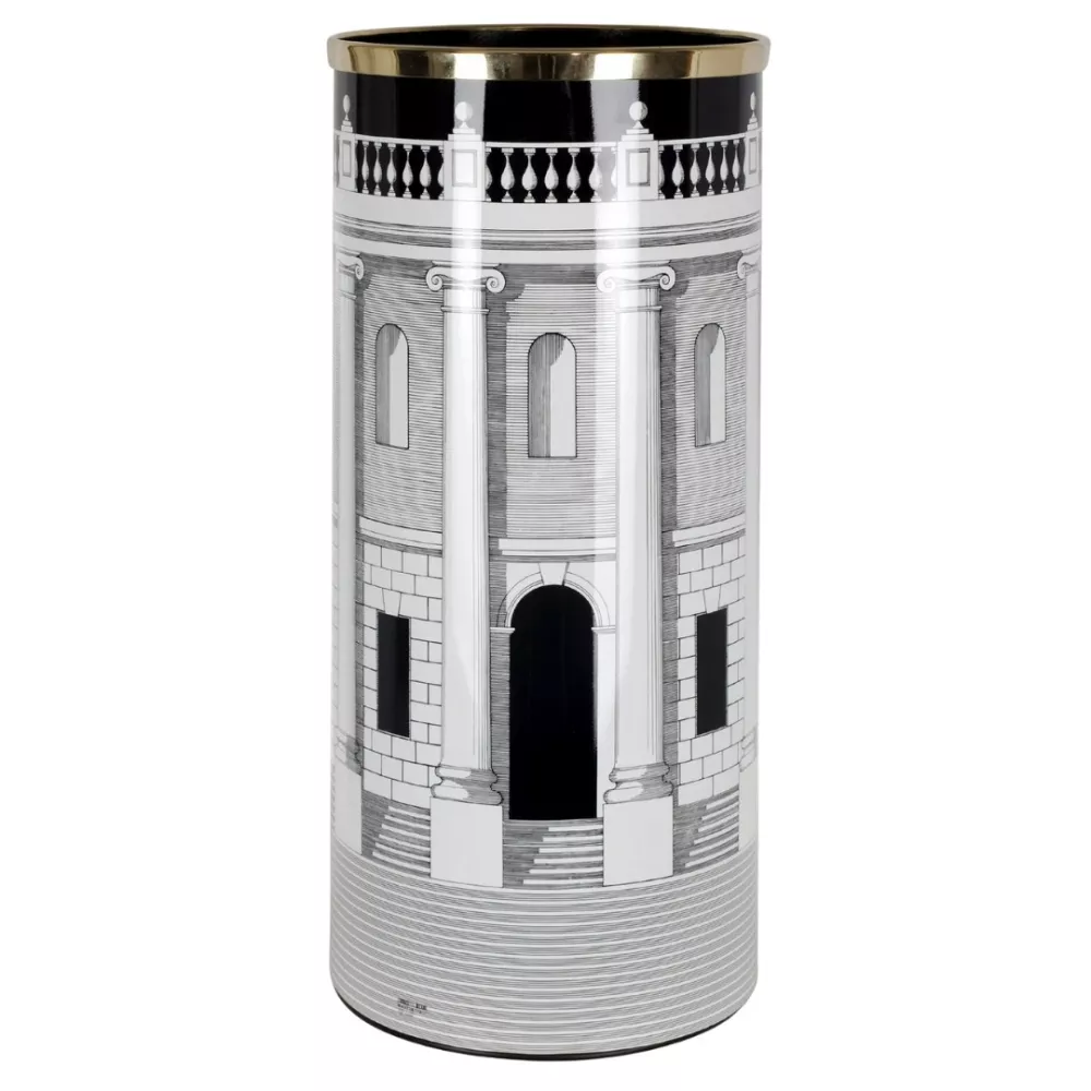 Inspired by Italian neoclassical architecture, the Casa with Columns Umbrella Stand by Fornasetti combines artistry with practicality. Made of silkscreened and hand-lacquered metal with brass rim and feet, it takes the shape of an elegant historic building, one of the Atelier’s iconic visual symbols. Sophisticated and functional, it elevates interiors with its refined style while serving as a daily-use piece. Each creation is handcrafted, making every item unique with slight variations that attest to its artisanal value.