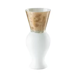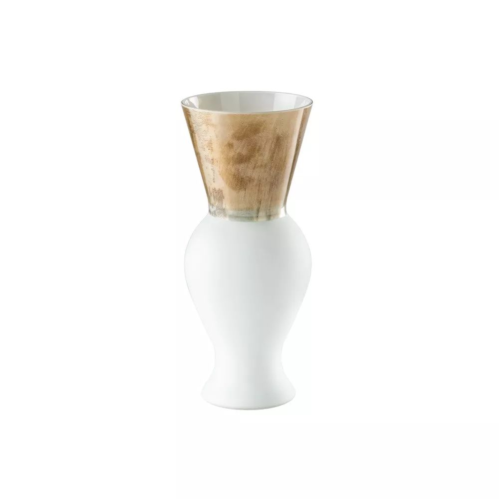 PRINCE VASE 515.09 - VENINI The "Principe" vase line by Venini is a collection of hand-blown glass vases made by Venini, known for its mastery of handmade glassworking. The "Principe" vases feature elegant shapes and sober lines, with glasswork that enhances their transparency and luminosity. Available in different sizes and colors, these vases are designed to embellish any room in the house, from the dining room to the bedroom. Each vase is a unique and artisanal piece, crafted with care and attention by the master glassmaker using traditional Venetian techniques. Milky glass, hot applied metal effect decoration + sandblasted Rodolfo Dordoni, 1996 SKU: 515.09 FEATURES H 30 x D 13 cm Weight: 1.15 kg