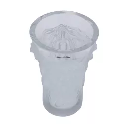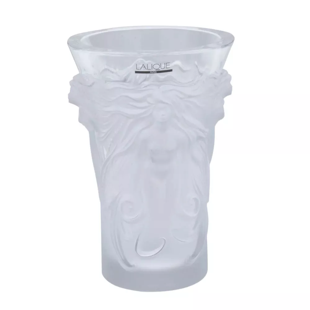 English translation of the Italian text: The Lalique Fantasia vase is a stunning creation that embodies the mastery and elegance of the art of crystal. The dreamlike scene depicted on the vase shows four Naiads, mythological figures symbolizing pure waters and springs, gently emerging from a cloud of dew. The Naiads' hair, beaded with drops of water, adds a touch of magic and mystery to the design. This unique artistic vision blends perfectly with the superb quality of the crystal vase, creating a work of art of rare beauty and refinement. The Lalique Fantasia vase is an ode to the timeless charm of nature, to the ancient legends that surround the imagination, and to the mastery of crystal craftsmen. The purity of the crystal and the harmony of the forms make it an object of desire and an invaluable gift for art and design enthusiasts. Dimensions: Height 17.7 cm, Diameter 11.8 cm Materials: Crystal