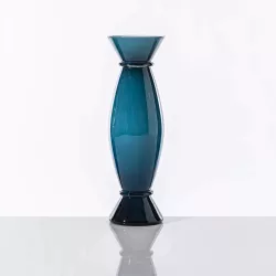 Create a magical atmosphere by choosing a unique Murano glass object. Acco, Idalion, and Sidone. A series of vases designed by Alessandro Mendini for Venin in the early '90s. Hand-blown and hand-worked, they are characterized by a thread of glass applied hot on the two narrowest parts of the vase. The classic and clean shape lends itself to stylishly decorating the space. An essential and sinuous collection that is part of timeless classics. Sku: 706.70 Collection: ACCO Processing technique: Blown Glass Color: Horizon Blue and Milk White Designer: Alessandro Mendini Dimensions: 44.00 x D 13.00 cm