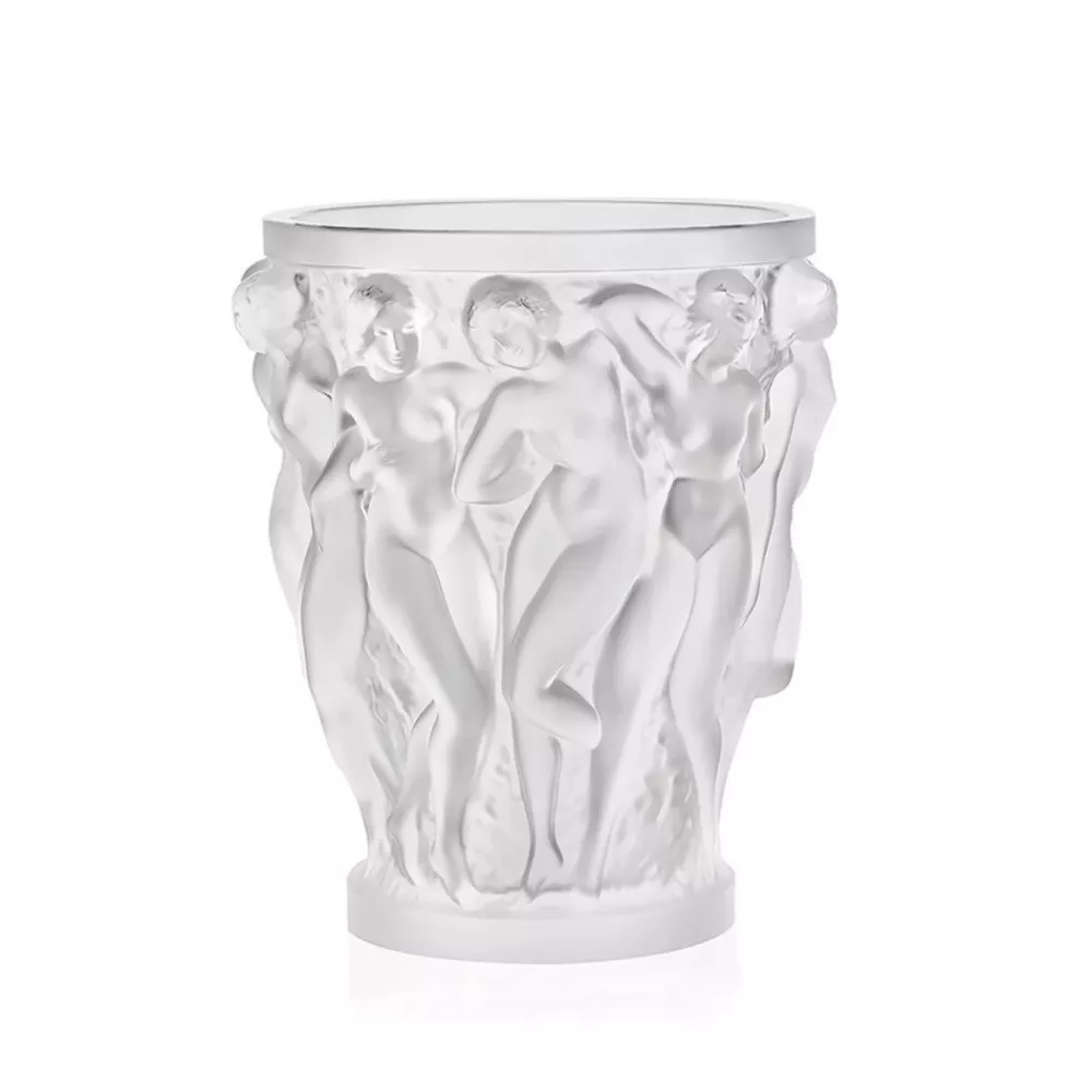 In 1927, the boundless imagination and creative genius of René Lalique led to the creation of the Bacchantes vase. With splendid insolence and intriguing sensuality, the young priestesses of Bacchus offered their beauty and their curves. Today, this majestic ode to femininity is reinterpreted in the small size vase. This round of sculptural nudes is an emblematic style of Lalique. The satin crystal recalls the smoothness of skin texture while the play of light breathes life and movement into the piece, shaped by the artist's hand. Material: Crystal Dimensions: M: H 14.6 x D 12.3 cm L: H 24 x D 21 cm Weight: M: 1.4 kg L: 6 kg Handcrafted in France