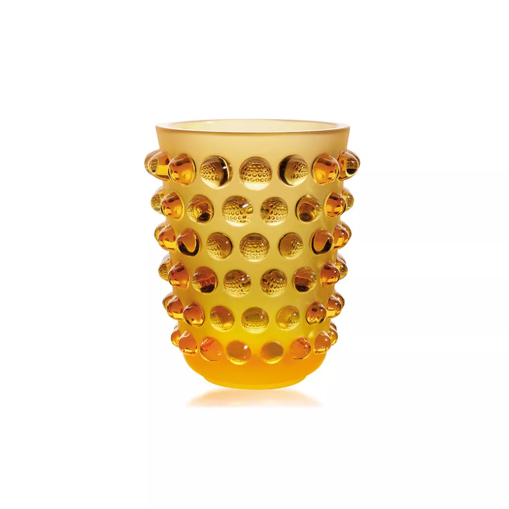 The kaleidoscopic effect of the Mossi Vase represents both a creative inspiration and a testament to great technical skill. Designed by René Lalique in 1933, this iconic piece was originally made of smooth glass, but the company reinterpreted it using amber crystal for greater intensity. A modern interior design element, the Mossi creates a fascinating contrast between the brilliance of its cabochons and the satin finish of its base. Collection: Mossi Reference: 10029000 Color: Amber Material: Crystal Dimensions: H 21 cm x D 17.8 cm Weight: 3.50 kg