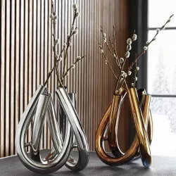 The Triu vases by Rosenthal Studio line, made from three tapered U-shaped arms, appear at first glance as metallic tubes fused together. However, in practice, these objects, which complement each other, available in gold, silver, copper, or transparent, add a touch of shine thanks to the durable borosilicate glass and fine titanium coating.