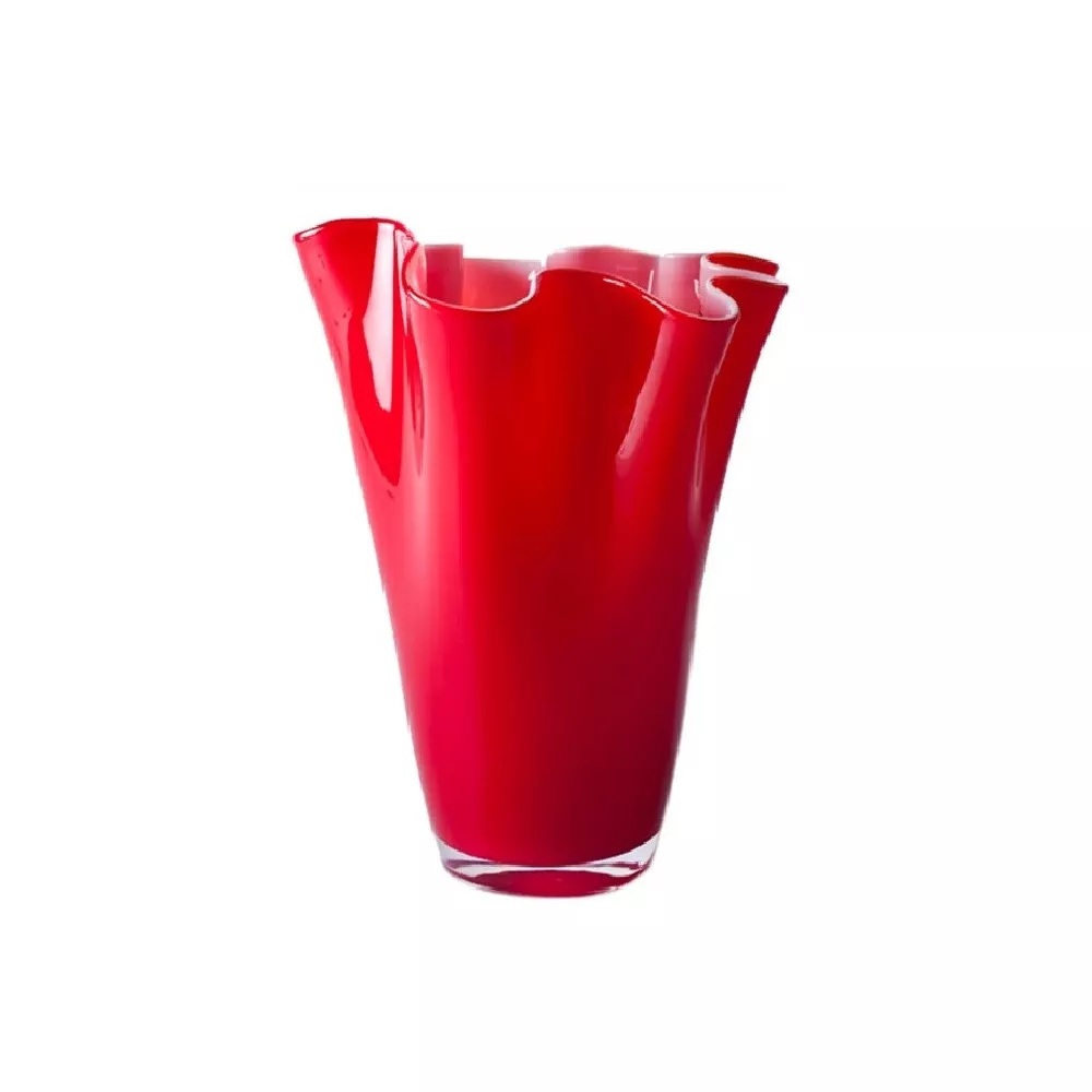 The Opal Wave Vase, handcrafted in Italy, is a unique piece that celebrates the ancient tradition of blown glass. Each vase, part of Onlylux's Wave collection, is mouth-blown, overlaid, and hand-finished, making it distinctive with features such as color variations, bubbles, lumps, and minor imperfections, all signs of its artisanal craftsmanship.