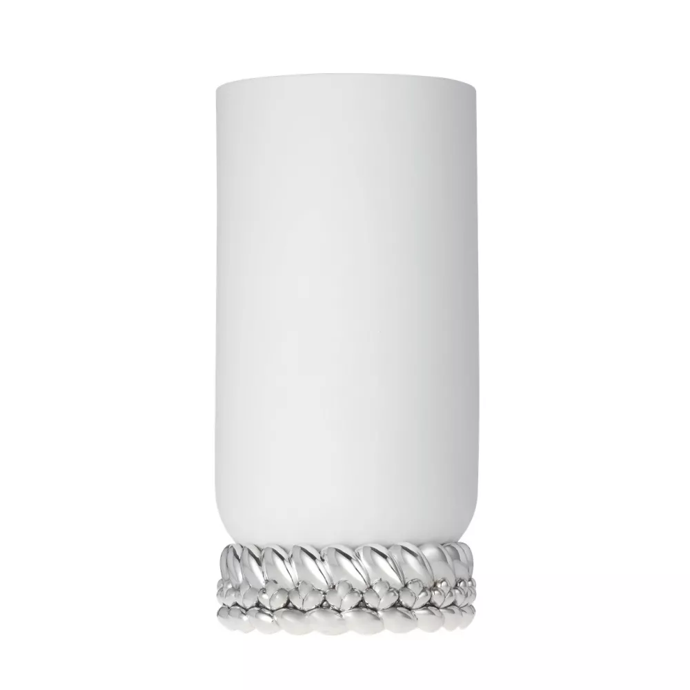 A refined blend of materials and textures, this vase from Christofle’s Babylone collection combines the purity of porcelain with a silver-plated metal base. The enameled interior contrasts beautifully with the matte exterior, while the patinated braid of the base adds a touch of elegance. Its modular design allows the vase to be separated from the base for easy cleaning and maintenance. Handmade in France.