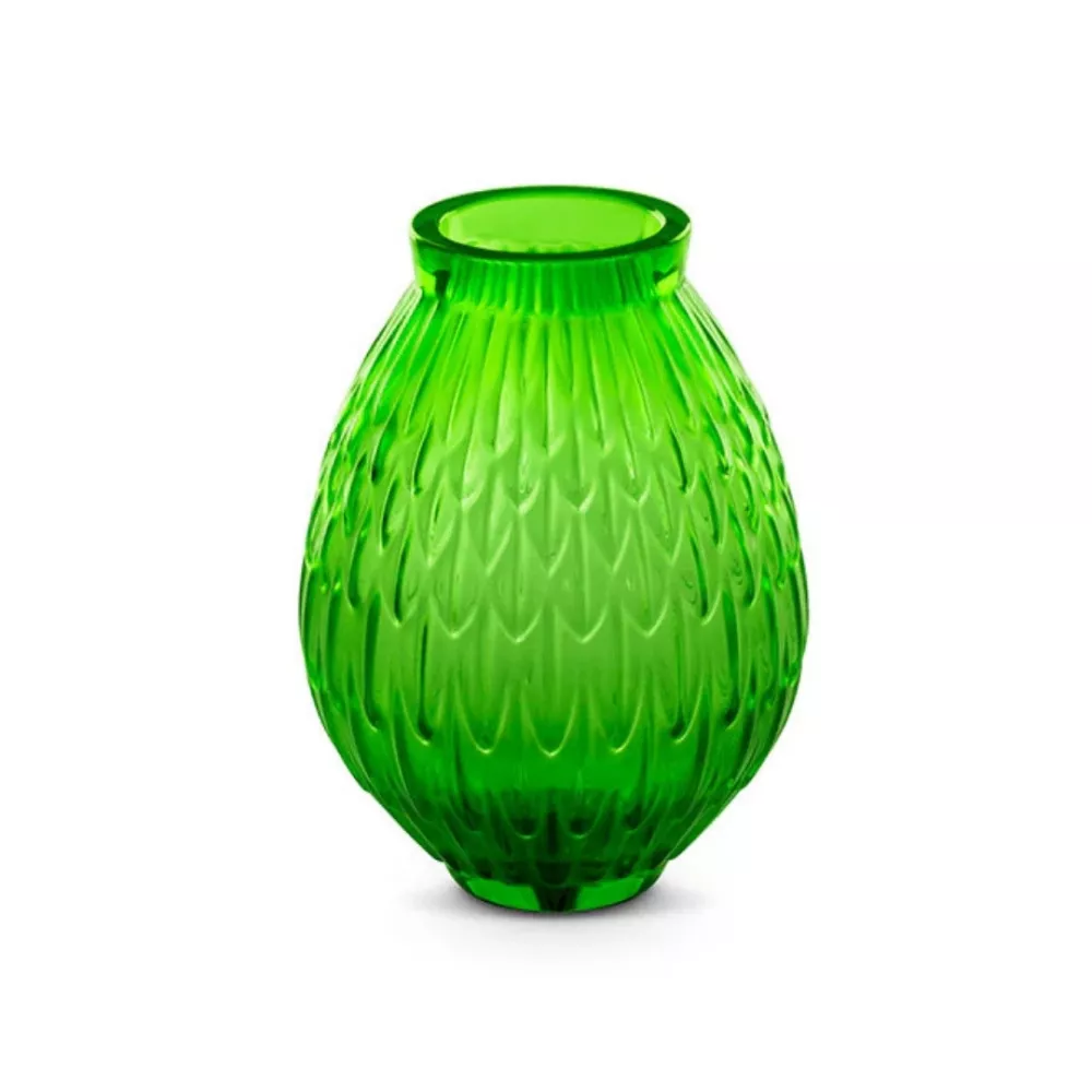 The Plumes vase in green crystal is inspired by the vivid plumage of the Amazon parrot, bringing light and vibrant color into a refined decorative piece. Its finely detailed surface enhances the transparency of the crystal, creating an object that blends nature with design. An exquisite addition to elevate interiors with contemporary luxury.