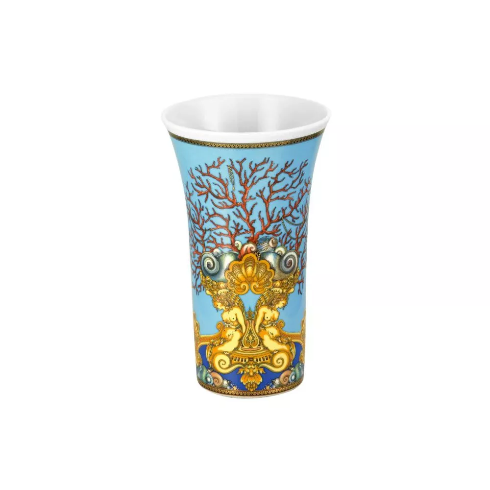 This stunning Versace pattern is called Les Tresors de La Mer. It is produced using the finest porcelain creating a style that is best described as luxurious and glamorous. The most prominent color of this item is blue. Lavish ornaments decorate this piece and make it a 'must have' for everyone in love with opulent design. Dimensions: h. 26 cm